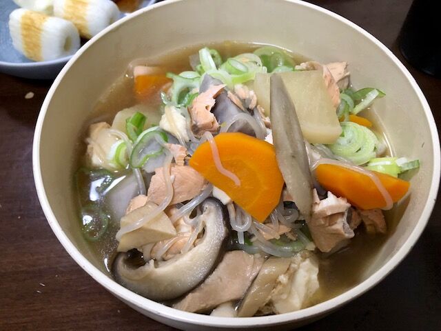 残り物にはうどんを入れたりお餅を入れたり、二日目もいける(*´▽`*)鮭の身がバラバラになってしまいましたが、七味唐辛子をたっぷりかけて、温まります。