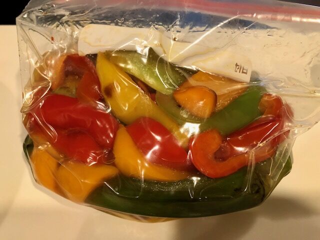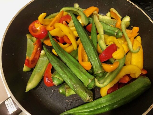 パプリカとオクラをオリーブオイルで焼いて。保存食に。お酢、大好きです。