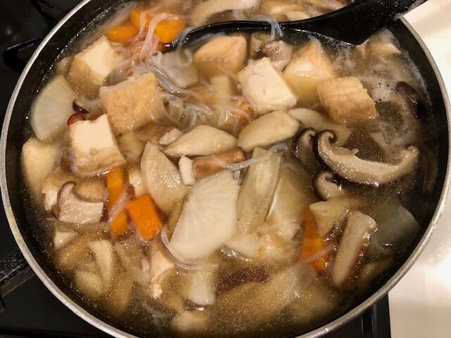 これでもかと根菜、きのこを入れて、芋煮風に。お肉の代わりに鮭を入れました。