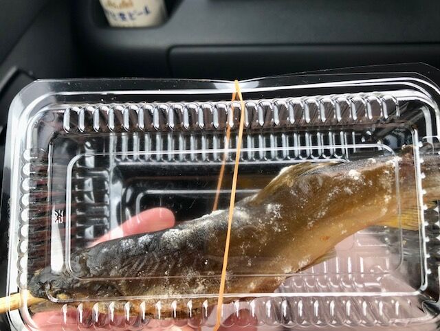 にんにく味噌のおにぎりと、焼鮎を購入して移動中の車で食した。