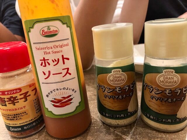 私は真っ先に粉チーズを持ってきたのですが、娘も取りに行っており見事かぶりました。