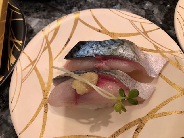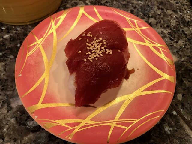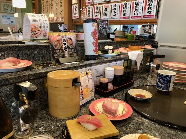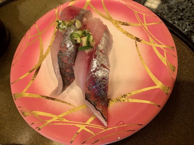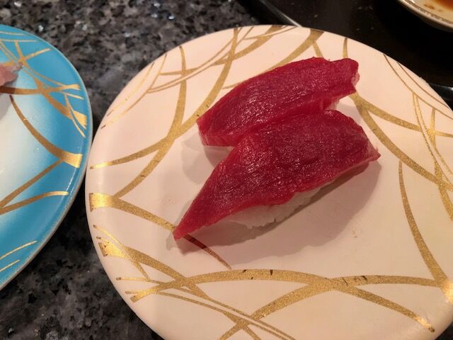 そしてね、ここのお寿司屋さん、同じネタを10皿くらい握って、トレーに載せて客席の方に進めてくるんですよ。
