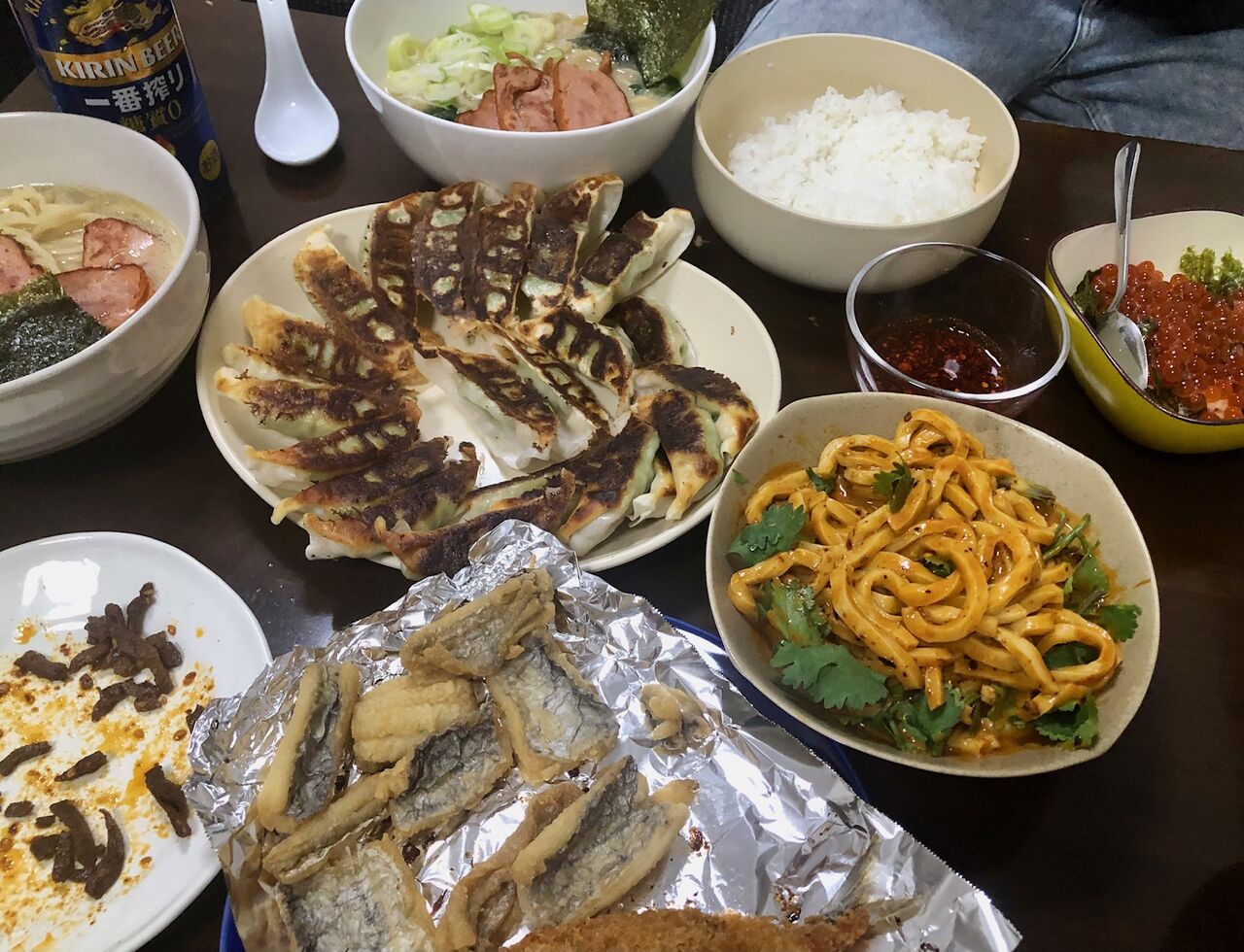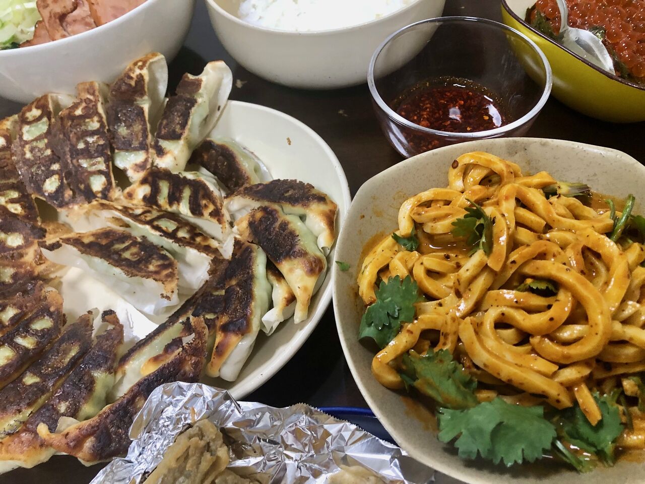 大量に焼いた餃子と、辛い米粉で作った麺。