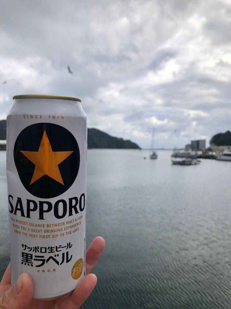海辺で缶ビール。