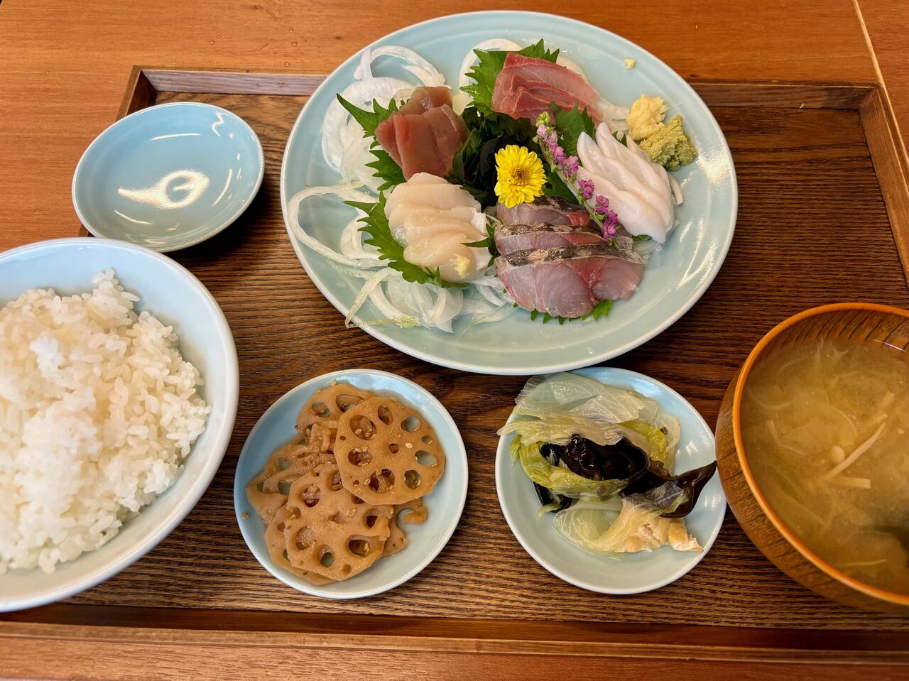 5種類のお刺身がきれいに盛り付けられていてテンション上がりますね(´∀`*)