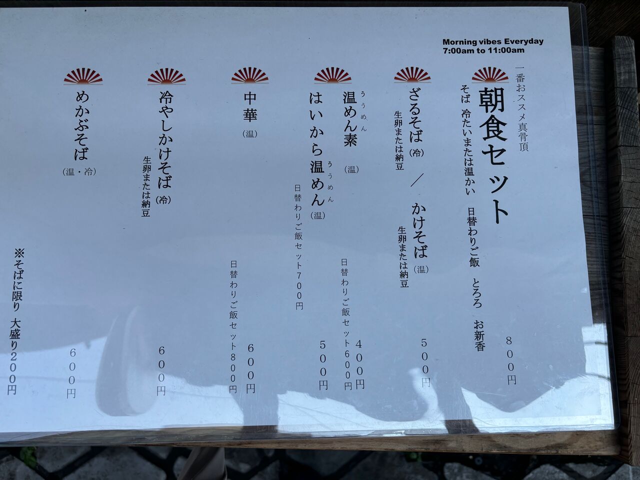 朝食セットひかれるけれど、この後飲みにも行きたいからざるそばかなあ、めかぶそばも美味しそうだし冷やしかけそばもいいなーーーー