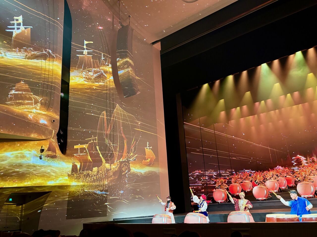 右下の楽団の演奏に合わせて映像が次々変わる舞台。