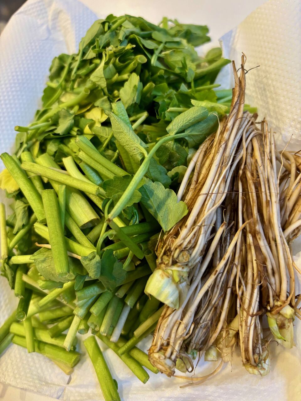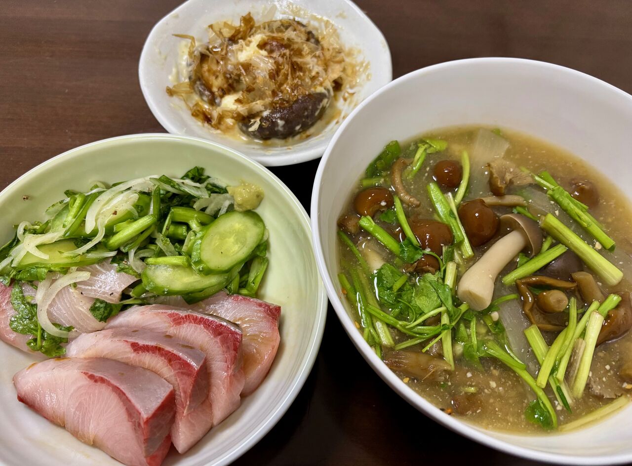 サラダ、たら菊、別盛パクチーで楽しい晩酌。