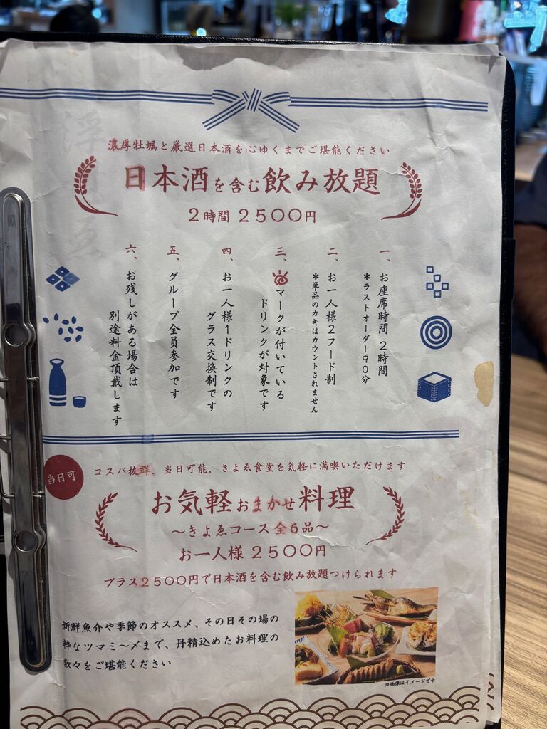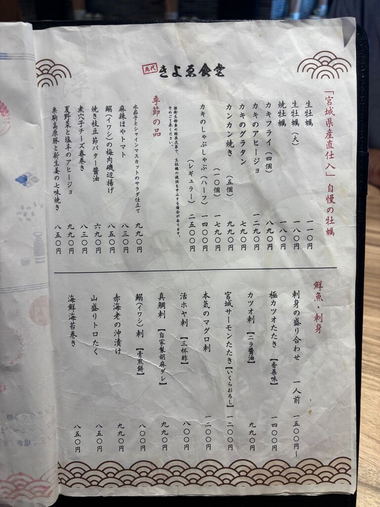 「きよゐ食堂」は以前、駅前エデンにあって海鮮、カッキーアワーの100円生牡蠣、日本酒豊富で素敵なお店だったんだよね。