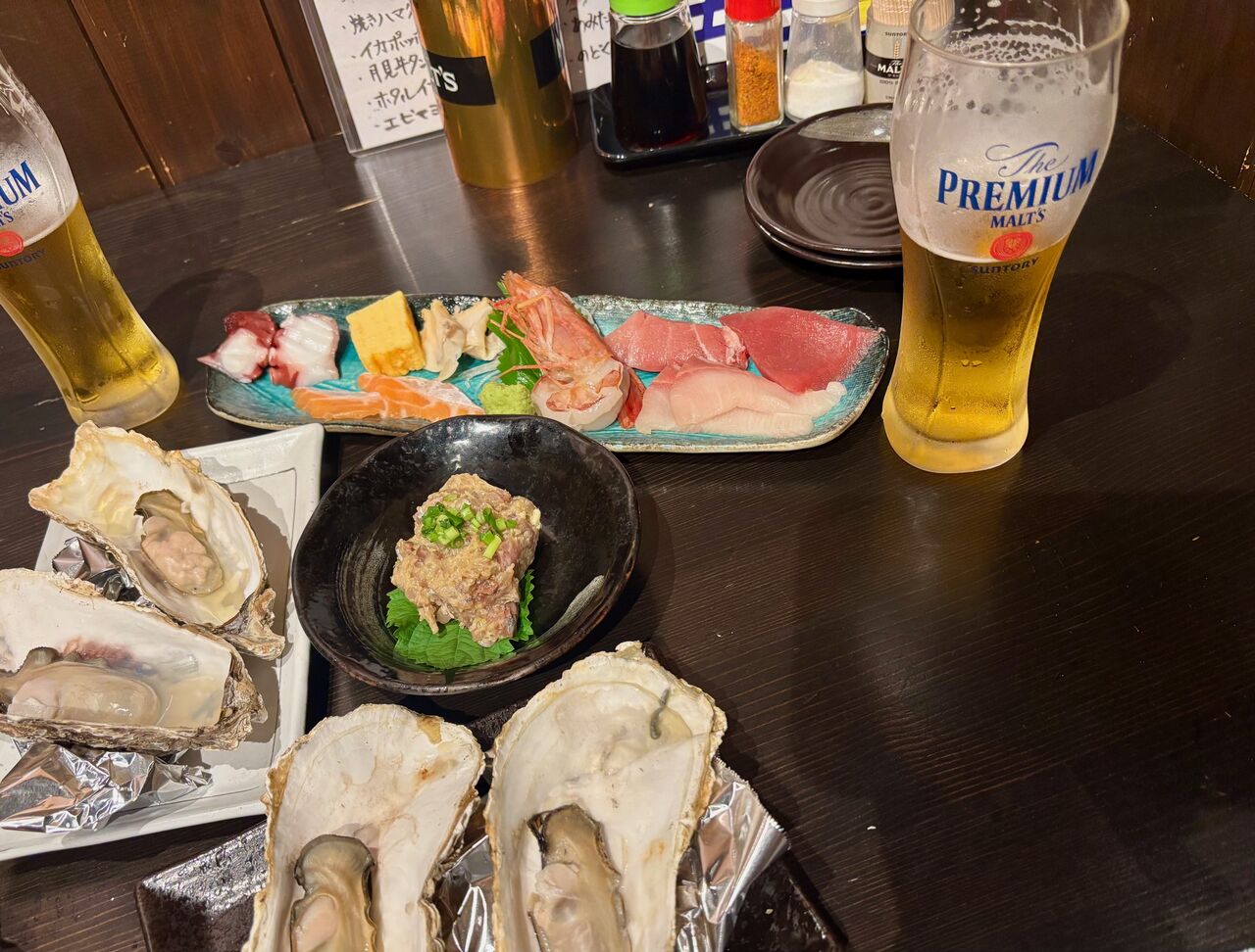 おまかせ刺盛と大好きなめろうを頼んだのだが全部変な具合に写ってしまった。