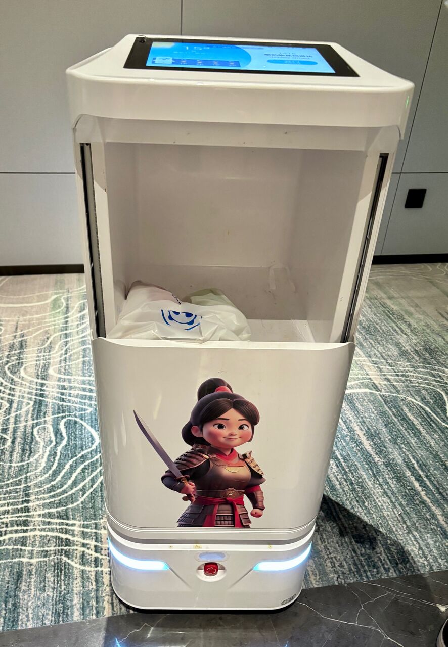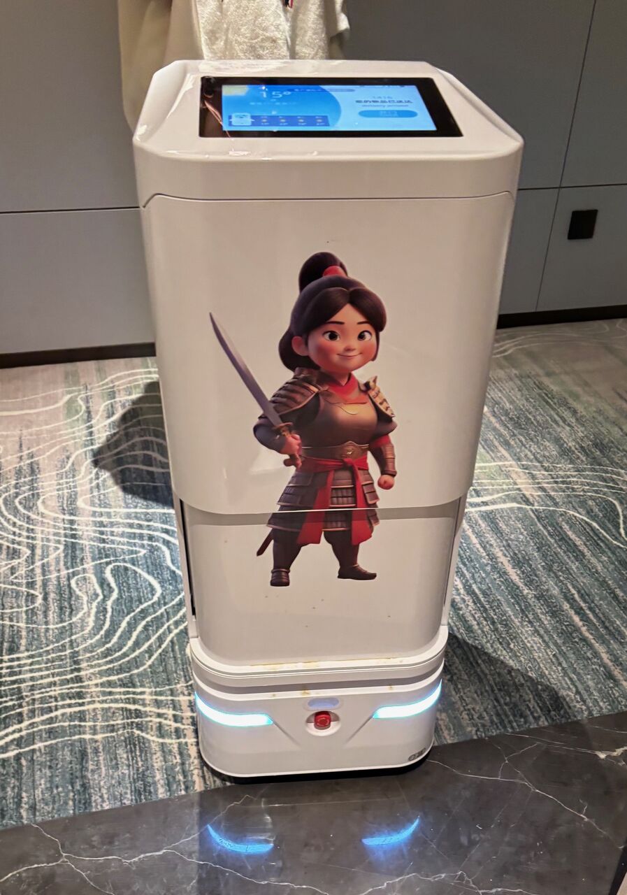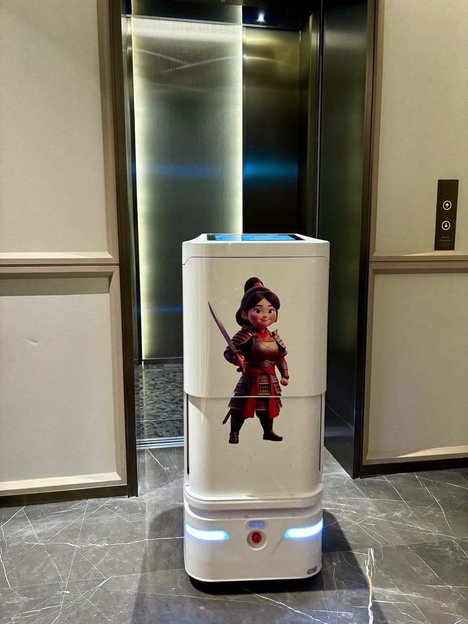 前面に描かれているキャラクターは、中国の伝説的な女戦士である**ムーラン(花木蘭)**をモチーフにしたイラストです。中国のホテルでは、ロボットを親しみやすくするために、このように現地のキャラクターやホテルのロゴなどのステッカーを貼ってカスタマイズしていることがよくあります。