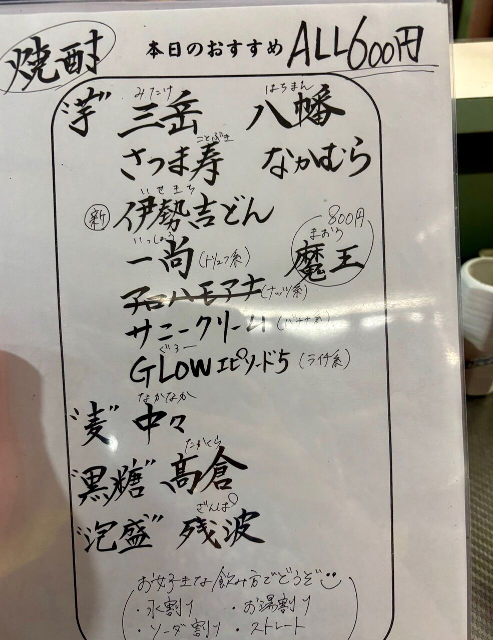 焼酎メニューと、