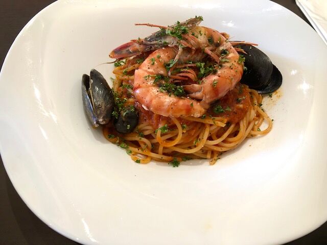 私は魚介のオリーブパスタに。
